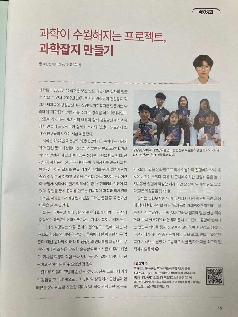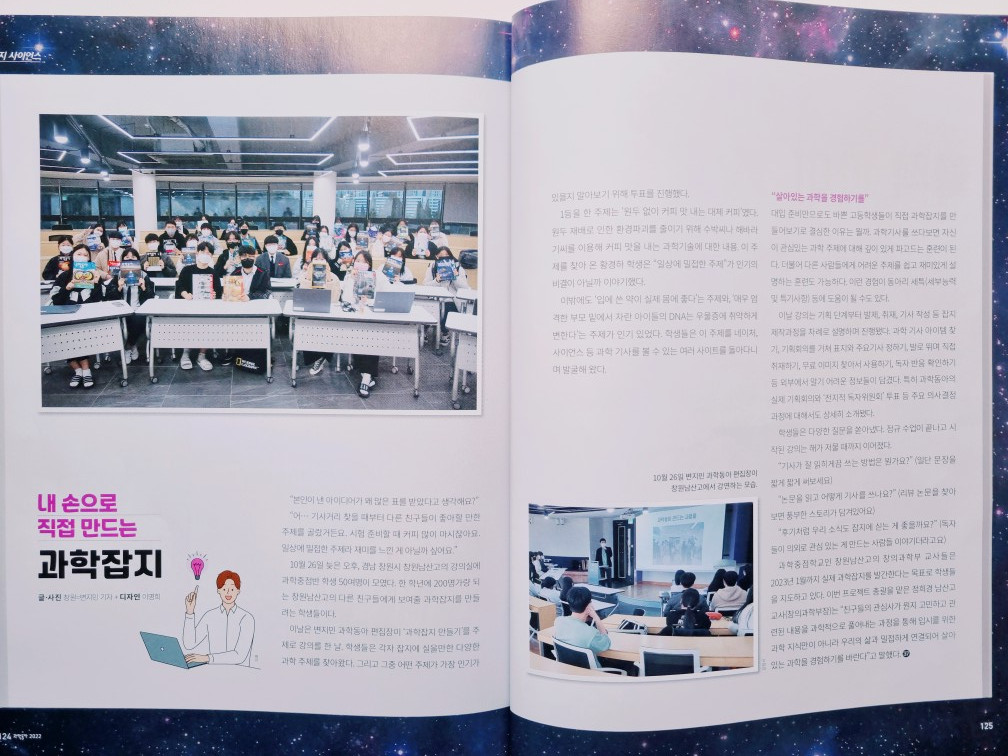우리 학교에서는 작년부터 과학동아리를 주축으로 13개 동아리가 연합하여 함께 제작한 남산과수원이라는 과학잡지를 발간하였습니다. 주내용은 과학중점학교에서 진행되는 과학프로그램, 과학동아리 활동, 최신의 과학 소식 등을 다루고 있으며, 처음 잡지를 만들기 위해 과학동아 편집장에게 강의를 듣고 시작한 인연으로 과학동아 2022년 12월호, 2023년 5월호에 우리 학교 학생들의 소식이 실리기도 했습니다. 힘든 일이지만 열정을 가지고 작업하고 본교 학생들에게 응원을 보내주시면 감사하겠습니다.