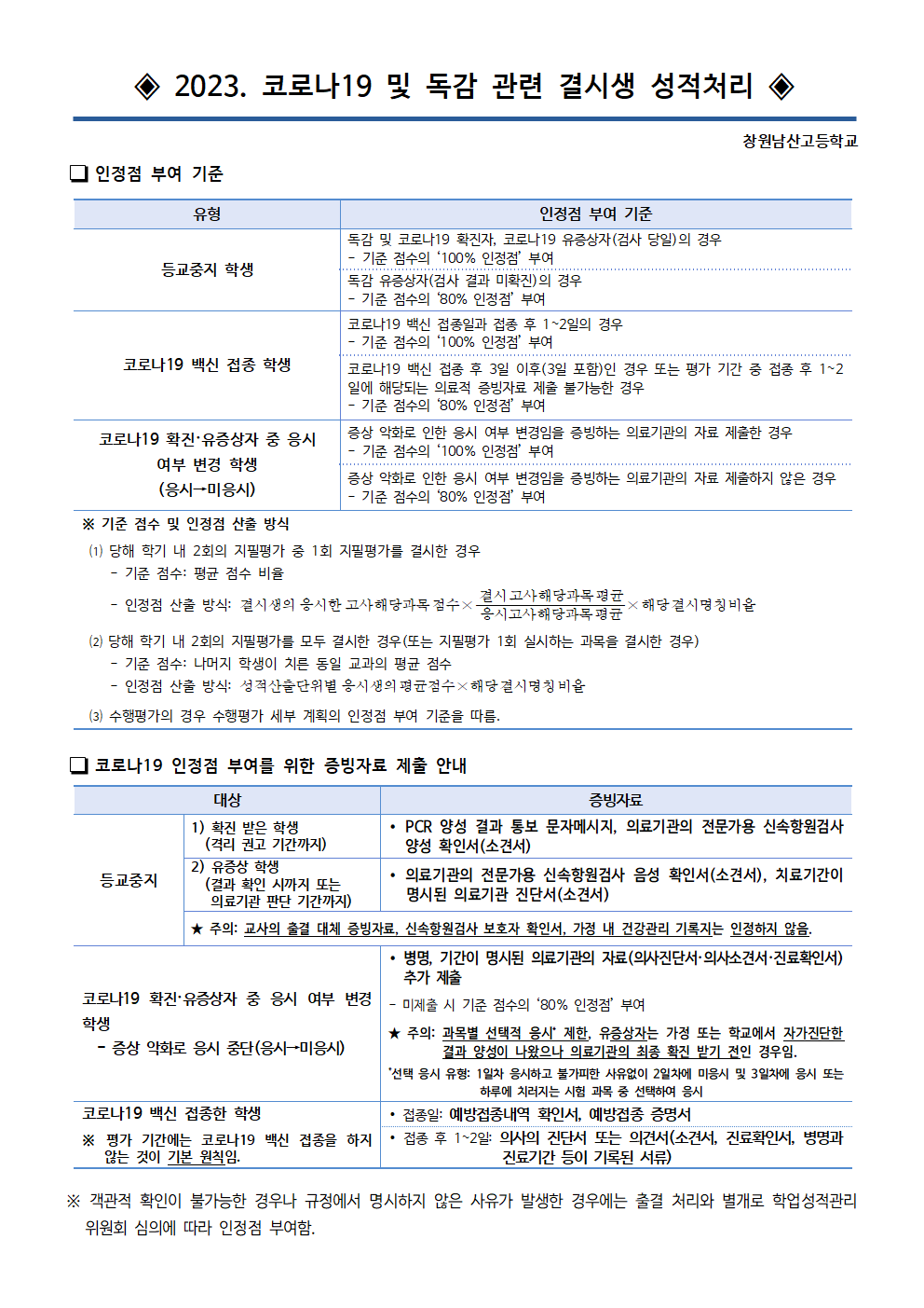 2023. 코로나19 및 독감 관련 결시생 성적처리 기준 안내