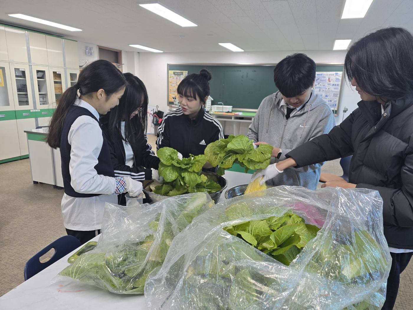 창원남산고 학생들은 학교 텃밭에서 다양한 채소를 키우며 여러 동아리와 학급 활동을 이어가고 있습니다. 텃밭의 잡초를 활용하는 방안을 탐구하거나, 텃밭 채소를 이용한 채식 식단을 제안하고, 식물의 광합성을 통한 이산화탄소 흡수 효과를 검증하는 등 친환경 비료 및 제초제, 모기 퇴치제를 만드는 활동까지 폭넓게 진행하고 있습니다. 특히 김장철을 맞아 2학년 3반 학생들은 학급 활동으로 여름 말에 심었던 배추를 수확해 김장을 했습니다. 배추 모종 심기부터 물 주기, 잡초 제거, 수확, 소금에 절이기, 양념 묻히기까지 모든 과정을 학생들이 직접 했습니다. 또한 배추를 키우며 배추 모종에 종이컵 씌우기, 배추 애벌레의 생태, 겨울철 배추의 단맛 증가 원인, 배추 속 항산화 성분, 삼투압 현상 등 다양한 과학적 지식을 학습하고 발표하며 함께 공유했습니다.